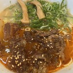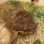 チャーシューは厚切りされ煮豚タイプの豚バラが使われており脂はトロッと濃厚で肉はほろりと崩れるほど柔らかく表面が炙られ香ばしく、牛スジは甘辛くとろとろなるほど柔らかく美味しくいただきました』(よっちゃんのパパさん)