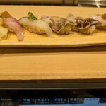 琵琶湖の淡水魚、北陸の魚、そしてサスエ前田魚店の魚を独自の工夫を凝らして寿司種に仕立てる。