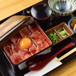 看板メニューは、茨城県産黒毛和牛“常陸牛”と、福島県産会津地鶏の卵黄を使用した「和牛レアステーキ重」1,800円。肉質によって2,400円、4,800円と用意していて、お重はステーキ重のほか、焼肉重1,800円〜や炙りネギトロ重1,500円もあります。肉増しのオプションメニューを追加すると、肉の量が1.5倍に!