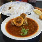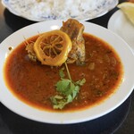 メインの八丁味噌コルマは大きくカットされた豚肉がゴロゴロと入り、デリーのコルマらしい玉ねぎのうまみと八丁味噌の奥深いコクと甘みがスパイスによって見事に調和した逸品。長ネギがあしらわれているのですが、見た目的にも味的にも意味を感じる薬味となっています。