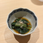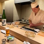 つまみが数種類供された後に握りとなり、握りの合間にもつまみを挟む「おまかせコース」27,500円〜には、修業先の親方へのオマージュを感じさせます。