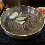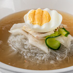 その特徴はなんと言っても、本場・韓国の咸興(ハムン)から仕入れるさつま芋の粉を使用した、特製の手打ち麺。透き通ったスープは、上品なコクが喉越しの良さを増幅させてくれます。