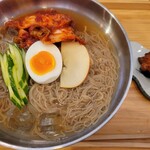 こちらで絶大な人気を誇るのが「キムチ冷麺」。麺はしっかりとそば粉を感じる、もちもちの細麺。自家製のキムチがスープに酸味を加え、絶妙な味わいを生み出してくれます。
