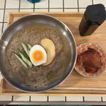 比較的酸味の利いたシャーベット状のシャリシャリ食感が楽しめるスープに、コシのある細麺がよく絡みます。別添えのキムチをのせることで、少しパンチの利いた味わいにも変化。