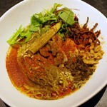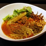 店名が独特だが味はど真ん中でストレート。ラー油とゴマのコクを生かした汁なし担々麺。しびれと辛さのバランスもよし、女性一人でも入りやすい雰囲気です。