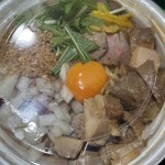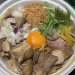 『限定。冷しゃぶ担々麺です。冷たいゴマだれにラー油のピリッと感、香辛料もきいたたれ。麺は自家製麺のパスタ用小麦を使った平打ち中太麺、水で〆られて、ゴマだれとラー油、香辛料のきいたたれが良く絡んで美味しいです。ちょいとピリッとですね。タマネギに水菜の食感も良く、トマトが冷やしに良く合って美味しいです。味玉も程よい味付け美味しいですね。レアチャーシュー肉肉しく歯ごたえ良くこれ又美味しいです。麺を食べ終えると?〆飯海苔卵です。投入して良く混ぜて、海苔の風味に卵drマイルドに、美味しいです。カイエンペッパー降って、ちょいとピリッと、これ又美味しいです。夏の暑い日にぴったりなピリッと美味しい一杯でした』(佐手久さん)