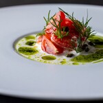 メニューはランチ、ディナーともに予約制のおまかせコース料理のみ。ランチは土日限定で5,500円、ディナーは8,500円とリーズナブル。イタリアの食材に日本の旬の食材を合わせた前菜を数品と、調理法にこだわったメイン、そして最後にはシェフのスペシャリテのティラミスで締めるなど丸本シェフの感性あふれるコース内容になっています。