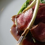 もう1つ注目したい肉料理が鴨のロースト。合鴨胸肉をたっぷり300g使って、中をレアに焼いた一皿。鴨は皮面を軽く焼いた後、オレンジジュースと赤ワイン、鴨の出汁をベースに八角やシナモン、クローブを入れた漬け汁に漬けてスローに火入れ。ソースにはマディラや長ネギ、しいたけ、りんごを使っている。漬け汁に八角やシナモンが使っているせいか、スパイスの風味もほんのり香る魅惑の味わいだった。