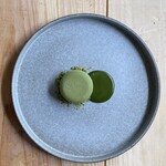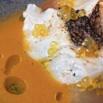 mesoのシグネチャーの一つとなっているのが「軽く焼いたトレビス 白いんげん豆ピュレ」。トレビスの4分の1のサイズを大胆に使って、アートな一皿に仕立てた前菜。トレビスをグリルし、甘みを引き出すソースと合わせることで、トレビスを白いんげん豆のピュレのクリーミーな甘さとともにいただける。もちろんトレビスの苦みもいいアクセントになった一皿として完成している。スパイスとナッツを混ぜたデュカも食感のアクセントになって、小気味よいおいしさがやってくる。