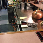 前の鉄板で調理をしてもらえ、シズル感満載。デザートの鉄板で焼くリンゴとアイスクリームのメニューもぜひ。