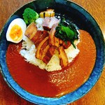 期待が高まったところでカレー。ピパーツ(ヒハツ、ヒバーチなどとも呼ばれる島コショウ)のフルーティな刺激が印象的なグレイビーは、島パインも隠し味となって程よい甘みと酸味が印象的。焼きを入れた鶏ガラと牛すじの香りとうまみにスパイスの香りの相乗効果。欧風とありますがカレーに小麦粉は使わず、フォンを使用するのが西洋料理的なので「スパイス欧風カレー」というわけです。
