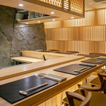 エレベーターを降りれば、そこは上質な和の空間。大谷石を敷き詰めた床に見事な組子細工の照明が印象的な店内は、こぢんまりとしていながらものどやかな雰囲気が漂う。樹齢100年余りという天竜檜の一枚板を用いたカウンター6席はオープンキッチン。臨場感もたっぷりだ。