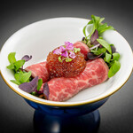 続いて、前菜に「和風タルタルサンド」、造りは「和牛刺身」、そして替り鉢の「和牛生ハム巻き」と生食系が3連発。もちろん、きちんと定められた規格基準をクリアした衛生面でも安心できる生肉を使用。刺身は霜降り肉と赤身肉の抱き合わせで、取材日は、堀井牧場の松阪牛のサーロインと内もも肉を用意。刺身を見れば、質の高さは一目瞭然。室温に置かれたそれは、置くほどに脂が溶けはじめ、表面がうるっと潤んでくる。脂肪の融点が低い証拠だ。
