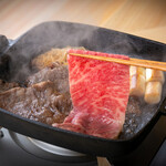 その後、マクラ(にのうで)と冬瓜、長茄子の抱き合わせが出て真打登場。「銀座吉澤」の看板料理の一つ“すき焼き”の出番だ。肉は堀井牧場の松阪牛。肥育日数33カ月の処女牛だ。霜降りも見事な肉は小豆色。融点が低いからだろうか、脂は軽くすんなりと胃の腑に収まる。