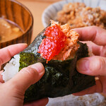 おにぎりは注文を受けてから作ります。型を使わずにふっくらと握り、中には具材をたっぷり。香り高い有明産の海苔でおにぎりの片面を巻き、もう片面はそのままに供されるので、パリッとした海苔の食感が失われません。