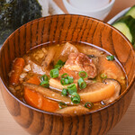 おにぎりのお供におすすめなのが「極み豚汁」。だしには6時間煮込んだ豚骨スープと野菜だしをブレンド。豚や野菜もゴロゴロと大きく、コクのある豚汁は栄養も豊富で食べ応えがあります。
