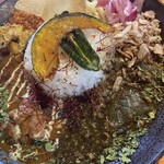 カレーは3種あり、もちろん、あいがけも可能。この日頼んだのは、3種あいがけ 1700円。