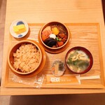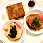 “駅弁おむすび”の「めめセット」は茶めしと信州味噌のおにぎりに唐揚げ、たくあん、卵焼き、杏がついて食べ応え十分。「秘伝だしの昆布」「炙り鮭」なども具がたっぷりで、激戦のおにぎりジャンルを勝ち抜けそうな味でした。早くも人気で18時ごろには売り切れてしまうようです。イートインでは「峠の釜皿定食」という、これまたそそられるメニューが用意されています。