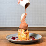 カカオ豆が持つブルーベリーのような果実味を引き出し、フルーティーな風味に仕上げたチョコレートです。トップに添えたチョコレートプレートと周りの赤ワインを使ったソースに用いています。優しい栗の甘みにブルーベリーのような酸味と甘みが加わり、果実と栗の相性の良さを実感できます。