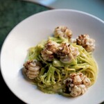 肉前菜として店の人気メニューなのが「仔牛 万願寺唐辛子 トンナート」。スライスした仔牛にツナソースを添えたイタリアの郷土料理「ヴィッテロトンナート」をアレンジした一品で、くさみのない生の仔牛をカルパッチョのようにいただく。ツナのクリーミーなソースがからみ、万願寺唐辛子の香りがアクセントになった楽しい一皿だ。