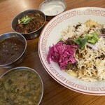 今回は「野菜カレーチキン付き」1,200円の小盛(-50円)と「ヒイカのアチャール」200円をトッピングして注文。付いてくるチキンは、限定の「西インド風チキンカレー」のこと。青唐辛子の爽やかな辛さとヨーグルトの優しさが印象的なカレーです。
