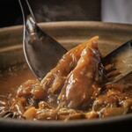 コースの中でも出色なのが「ふかひれ鍋」です。気仙沼産のフカヒレの真ん中部分にあたる肉厚な部分のみを使用した贅沢な一皿には、大ぶりの蝦夷アワビも! 鍋を楽しんだ後には、〆の「ふかひれご飯」としても楽しめるうれしい演出も待っています。