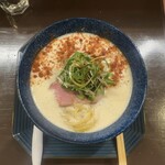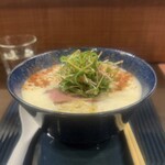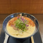 CURRY辣々麺は提供時に「手前の緑色のオイルの方から酸味を探しながら食べてください」という案内がありました。この緑色のオイルは何かと言うと、トスカーナ産のヴァージンオリーブオイル。案内があるからこそそれをイメージするとより味の深い部分まで感じられます。