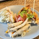 まずは何かつまみたいというときのおすすめは、チーズ。毎週、神楽坂のチーズ専門店「アルパージュ」から届く5〜6種類のチーズが用意されている。ウォッシュタイプやハードタイプなどいろいろな種類があって、ワインに合わせて選ぶことも、好みのタイプを選ぶこともできる。この日はブリー・ド・モーとマール・ド・ゲヴュルツトラミネエールの2種類の白カビチーズを選んでもらった。