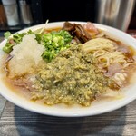 麺には人気ラーメン店の麺を多数手がけているカネジン食品のストレートの中太麺を使用。少し硬めのパツパツした麺は、濃厚なスープによく合います。トッピングではメンマを黒メンマに変更し、もみじおろしが追加されています。