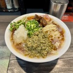 トッピング・・・岩のり、豚もも、玉ねぎ、味玉、めんま。味玉はインスタフォローサービス。豚も2枚ほど入っててボリュームありで美味しい!