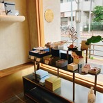グレーでシックにまとめられた店内は、洗練されたギャラリーのよう。四角やかまぼこ形などさまざまな形の陳列棚には、ギフトにぴったりな焼き菓子がディスプレイされています。