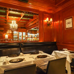 新店舗は、以前の店舗の雰囲気はそのままで、ひっそりと佇む外観ながらも、店内にはきらびやかなシャンデリアが特別な空間を演出。コントラバスの重厚な設えでありながらあたたかでリラックスした空気に満ち、ゆったりと食事を楽しめます。