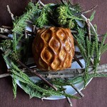 さくさくのパイ生地の中に、マコモ茸、秋トリュフのミルフィーユ、帆立のムースのファルスを詰めて、こんがりと。