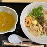 この麺と相性抜群なのがスープです。「賞讃」自慢の煮干したっぷりのだしに昆布を追加した昆布だしを作成。数種類の魚介の節から取った和風だしにうどん店ならではのかえしを合わせ、昆布だしで調整。さらに、できあがった和風だしスープに背脂と香味油でコクをプラスしています。