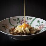 2024年11月のコースを例にすると「キャビアビーフン」「松茸上湯スープ」「手羽先 フォアグラ」など、高級食材を使った料理が並びます。また「翡翠賀茂茄子 XO醤」「甘鯛 油淋 炭火」といった京都ならではの食材を使った中華料理も絶品のおいしさと評判です。