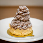 吉田氏の代表作といえる「モンブラン」。クリームの絞りが非常に特徴的だが、ビジュアルのためではなく味わいを豊かにするためだったと教えてくれた。「マロンのクリームと、土台のパイ『パート・フィロ』のバランスを考えた時、クリームをしっかりと味わっていただくためにボリューム感ある絞り方にすることが自然な選択でした」