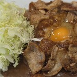 しょうが焼きといえばキャベツも合いますから、ここにキャベツをのせると濃厚なカレーの良い箸休めともなります。キャベツの量もうれしい山盛り。