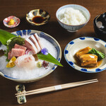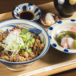 海に沈む夕日を見ながら、琉球和会席のコース「TEEDA」がスタートした。前菜は「長命草と苦菜、柑橘の白和え」、豚肩ロースや魚のすり身を合わせて蒸しあげた、優しい味の「シシかまぼこ」「和三盆カステラ玉子」、イカを飾り切りにした「花烏賊」が色鮮やかに盛られ食欲を刺激する。