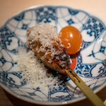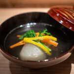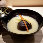 はじめに供されるのが「お吸いもの」。この日は鱈の白子とすり身の蒸しものを椀種に、鶏白湯と白味噌を合わせて吸い地にしていました。白味噌を鶏白湯がキリッと引き締めた、ありそうでなかった味わい。焼鳥+和食という湯澤さんの意図を表現した最初の一皿にふさわしい料理です。