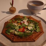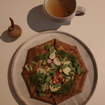 お花にちなんだクレープメニューが人気です。ネーミング通り“花束”をイメージした「ブーケクレープ」(1,600円~)は、目にも美しい食事系クレープ。オリジナル配合の“黄金クレープ”に、色鮮やかなパワーサラダを合わせました。メイン食材は、ハモンセラーノ、スモークサーモン(+100円)、ローストビーフ(+100円)から選べます。