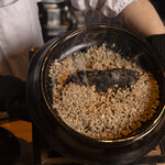 この店の名物ともいえる「そぼろご飯」は、疋田さんが修業した「ヨシモリ」から受け継ぎ、進化させたものだ。土鍋でふっくらと炊いたご飯に、薪で焙った鶏そぼろ、生の玉ねぎのみじん切りを完全に一体化するまでよく混ぜて、最後にもう一度、薪の香りをつけるため直に薪を入れて仕上げる。