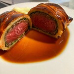 こちらに合わせたいのはフランス・ローヌ地方のシラーを使った赤ワイン。「仔羊にはローヌの赤ワインが定番です。濃密さがあるので、よく合います」と西見さん。コショウのスパイシーさもある風味が仔羊のパイ包み焼きを引き立てていた。