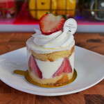 中目黒の人気パティスリーで「食べログ スイーツ TOKYO 百名店」にも選出されている「パティスリー カカオエット・パリ」。こちらの「ヴェリンヌ ショートケーキ」はグラスタイプのショートケーキで、中には、いちご、クリーム、ビスキュイ、いちごのピューレがバランス良く入っています。ストローが刺さったショートケーキなんて斬新ですよね。クリームはふんわりと軽く、いちごピューレも酸味が利いているため、全体的にさっぱりとした味わいです。ストローで味わうという斬新で個性的な発想は、まさに唯一無二。目黒川の近くにあるので、桜を見ながら“飲むショートケーキ”を味わう、というのも乙ですよ。