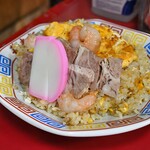 見た目のインパクトもさることながら、完成度の高い「五目チャーハン」が名物の町中華。炒飯の上にはエビ、カマボコ、チャーシュー、卵焼きがゴロゴロと盛り付けられています。中華鍋を振るベテラン女将の存在もまた味わい深い。