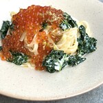 アローロで女性に人気のパスタメニューは「いくらのレモンクリームパスタ」。季節ごとに野菜が変わり、このときはカーボロネロ。いくらのオレンジに映える色合いが食欲をそそる。そしてなんといっても「これでもか!」と入っている宝石のようないくらがクリームパスタの上で輝いているのが美しい。“レモン”クリームパスタだがクリームにレモンが入っているわけではなく、削ったレモンピールがトッピングされているため、ほのかにレモンの風味が感じられる仕上がりとなっている。