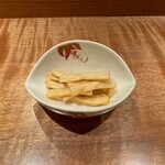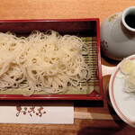 営業は夜のみで、そば前と更科そばを楽しむ「更科蕎麦コース」25,000円と、名物の「トリュフ蕎麦」を堪能できる「トリュフ蕎麦コース」45,000円を用意。そば前は、季節の食材でゲストの好みや酒に合わせて作られる豪華な前菜6点盛りやスープ、お造り、焼き物もしくは揚げ物など。そば同様に出汁やかえしで味付けがされた肴はいわば出汁料理。