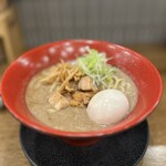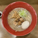「濃厚豚骨 味玉」をオーダー。スープは京都の銘柄豚「京都ぽーく」の豚骨をふんだんに使って、鶏ガラと数種類の野菜と一緒に強火力で炊き込んで作っているそうで、濃厚でクリーミーでおいしかったです。