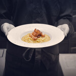 看板商品の「王道ベーコンのカルボナーラ」1,680円は、卵とチーズのコクを存分に味わえる一皿。黄身がオレンジ色で濃厚なうまみのある卵を選び、1人前あたり卵2個を使用しています。チーズは、パルミジャーノ・レッジャーノより香りが控えめでまろやかな風味のグラナ・パダーノ。材料は数グラム単位で味わいが変わるので、レシピに忠実に調理するよう心がけているとか。パンチェッタよりもうまみの強いベーコンと、隠し味に昆布やカツオなどの和風だしを加えることで、香りに奥行きを出しています。