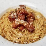 旨い!しっかりとした味わい!濃厚なカルボナーラかな? 私は結構濃厚、濃いめな味付けが好きなので、高級イタリアンのカルボナーラとは違うかもですが、私は、かなり好きなカルボナーラ!卵、チーズ、黒コショウなど全てバランスよくおいしい!生クリーム一切不使用がまた旨さの秘密か?麺の食感もソースとのマッチ度、絡み具合も勿論 …. 絶妙!やはり、普通のカルボナーラと違う!旨い!』(特盛ヒロシさん)