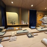 新店舗は京都の町屋をイメージした高級感あふれる内装で、落ち着いた雰囲気。客席は職人の手仕事を間近に見られるメインカウンター9席と個室カウンター5席があり、日常を忘れて静かな時間を過ごせます。